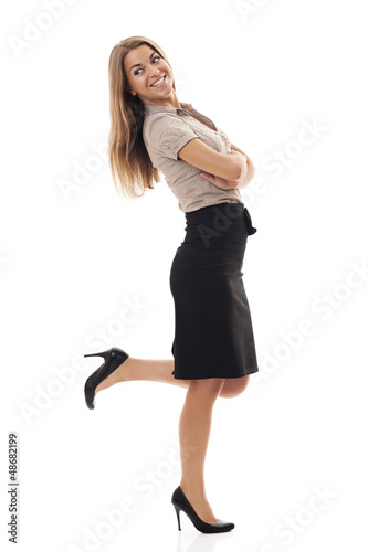 © gpointstudio, Fototapeta premium Successful businesswoman kicking up foot