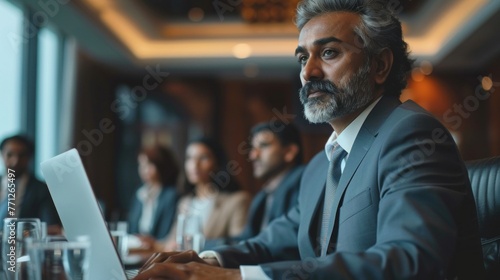© 2D_Jungle, Fototapeta premium Successful Indian CEO Making a Presentation on a Laptop to a Board of Directors During a Corporate Meeting. South Asian Business Partners Discussing International Markets