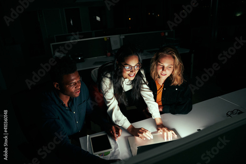 © StratfordProductions, Obraz premium Successful multiethnic business team working on laptop over office desk at night