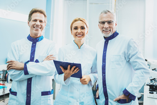 © Viacheslav Yakobchuk, Obraz premium Successful scientists. Cheerful colleagues keeping smile on faces while being in the laboratory