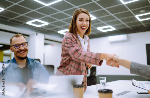 Fototapeta premium Successful team. Group of young businessmen working and communicating together in creative office. Brainstorming concept. Planning, education, analysis, collaborate work in teamwork.