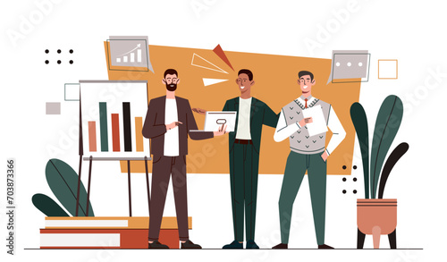 © Rudzhan, Obraz premium Successful team work concept. Man stands near graphs and diagrams. Statistics and infographics. Partners and colleagues work at common business project or startup. Cartoon flat vector illustration