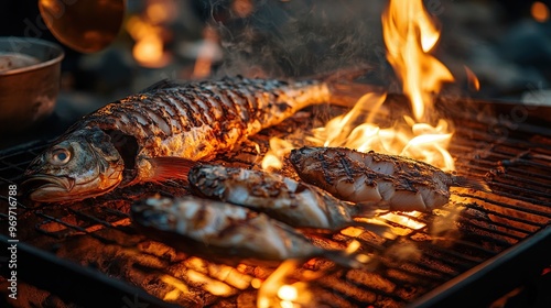 Fototapeta premium Succulent fish and assorted seafood sizzle over an open grill, surrounded by...