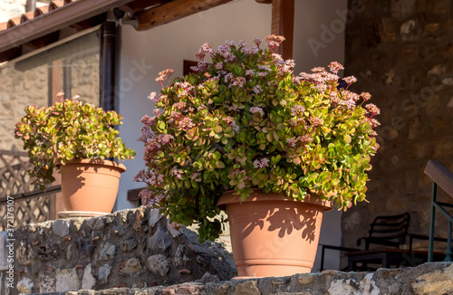 © TETYANA, Naklejka premium Succulent plant (Crassula) with delicate flowers grows close-up