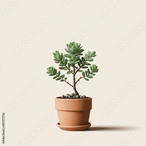 © Dmitriy K., Obraz premium Succulent plant in terracotta pot on beige background
