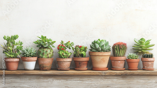 Naklejka premium Succulent plants grown in pots on wooden boards