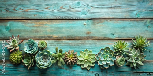 Fototapeta premium Succulents arranged on a rustic teal wooden surface create a vibrant, natural...