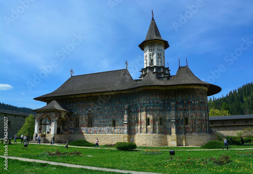 © LourPhoto, Fototapeta premium SUCEVITE MONASTERY, BUCOVINA, ROMANIA, EUROPE, SPRING 2018. Orthodox monastery. Moldovan architectural style. Open-air paintings, frescoes and portraits of saints with Byzantine influence.
