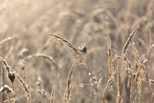 Fototapeta premium Sucha trawa rano o wschodzie słońca