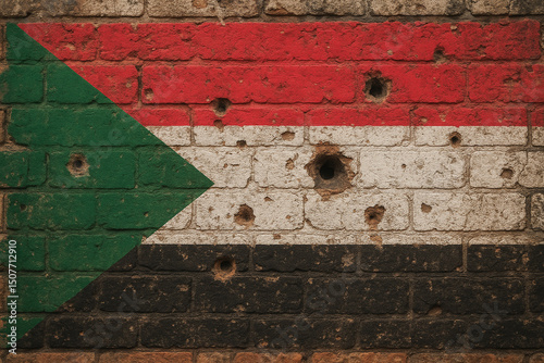 © paulomgodoy, Naklejka premium Sudan Flag Bullet Hole Wall