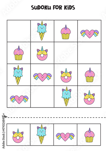 Fototapeta premium Sudoku game with unicorn elements for girls.