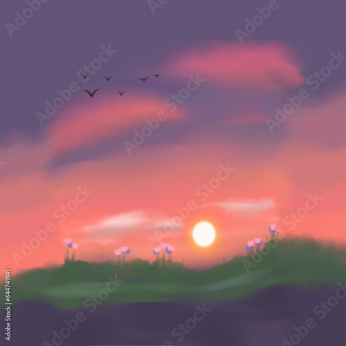 Obraz premium Sue Fah in the evening, the sun is about to set. Violet light mixed with orange sunshine. green grass hills and flowers