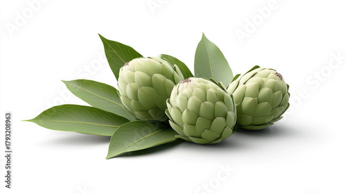 © syhin_stas, Obraz premium Sugar apple fruit with leaves on white background, realistic botanical illustration style, detailed textures