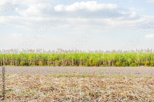 Obraz premium Sugar cane and Workers havesting sugar cane on field at Tay Ninh, Vietnam.