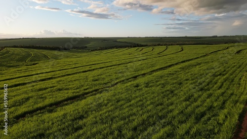© Raje Photos Stock, Naklejka premium Sugar cane hasvest plantation aerial. Aerial top view of a agriculture fields. Sugar Cane farm. Sugar cane fields view from the sky. Cana-de-açúcar produzindo energia renovável. Etanol. 4K.
