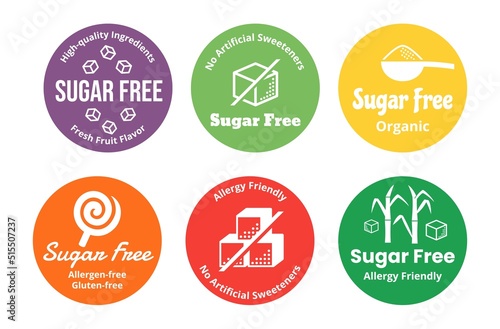© Vikivector, Obraz premium Sugar free allergy friendly colored circle stickers set vector organic food round packaging stamp