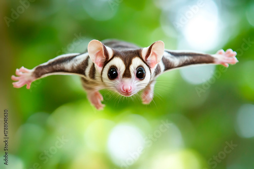 © Andrey, Obraz premium Sugar glider enjoying movement, extending its patagium, soaring with a gentle expression against a blurred green background