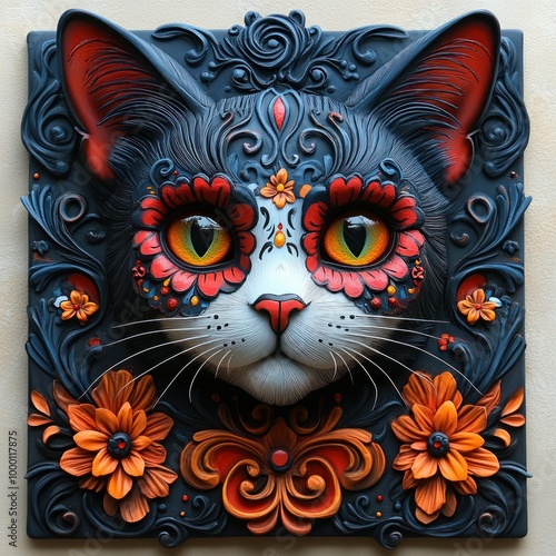 Naklejka premium Sugar Skull Cat Celebrating Dia de Muertos - Day of the Dead Festivities