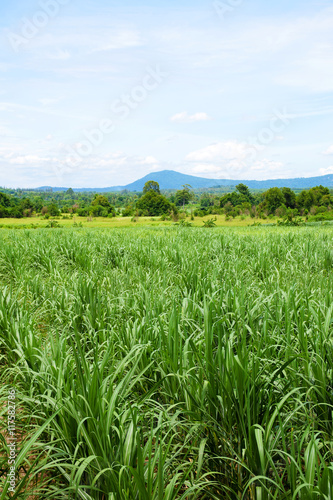 © sky1991, Obraz premium Sugarcane field with blue sky background. Travel in Thailand.