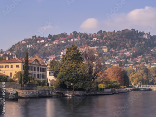 Obraz premium Suggestive pedestrian path runs along the lake in fall season.Autumn landscape on Como lake, Lombardy, Italy.