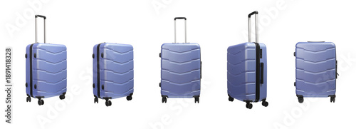 © valiantsin, Fototapeta premium Suitcase set. Wheeled luggage with telescopic handle, side grip and hard protective case in blue and
