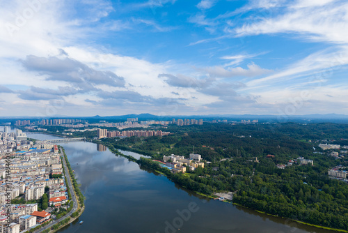 Obraz premium Suizhou City Hubei Province China shows buildings lining a river and green...