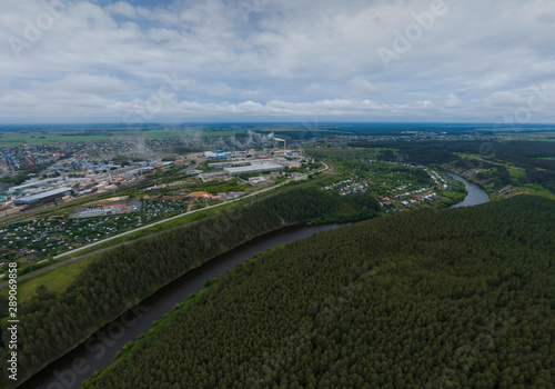 © flyural66, Fototapeta premium Sukhoy Log city, Pyshma river, dark forest and cement factory. Russia, Aerial, cloudu day