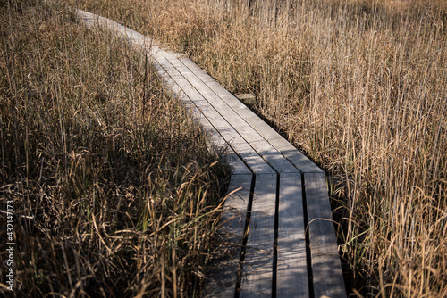 © Bargais, Fototapeta premium Sulfur ponds in swamp and wooden footbridge trail, Kemeri, Latvia.