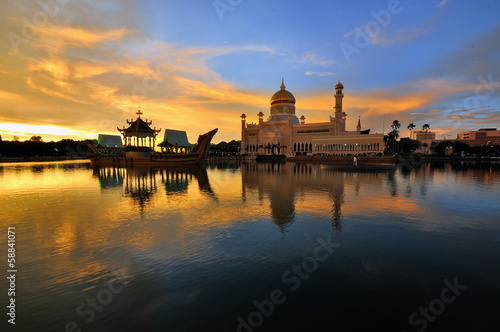 © azrisuratmin, Fototapeta premium Sultan Omar Ali Saifuddien Mosque, Brunei during burning sunset