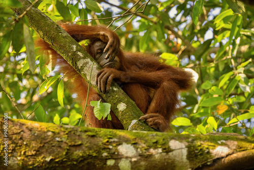 Fototapeta premium Sumatran orangutan in its whole beauty. Amazing sumatran jungle. Beautiful...