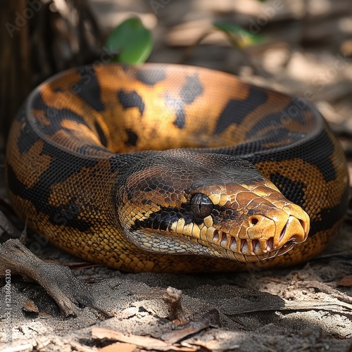 © musa, Fototapeta premium Sumatran short-tailed python coiled on the ground, close-up.