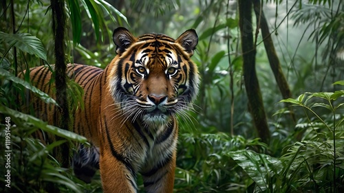 Fototapeta premium Sumatran Tiger crouching in a misty jungle, piercing eyes focused, surrounded...