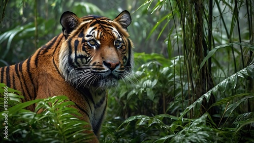 Fototapeta premium Sumatran Tiger crouching in a misty jungle, piercing eyes focused, surrounded...