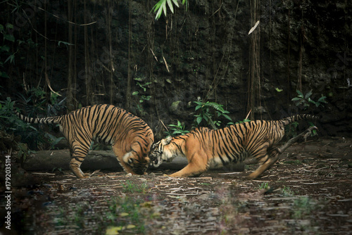 © Pitokung, Fototapeta premium Sumatran tigers are seen fighting in the bushes