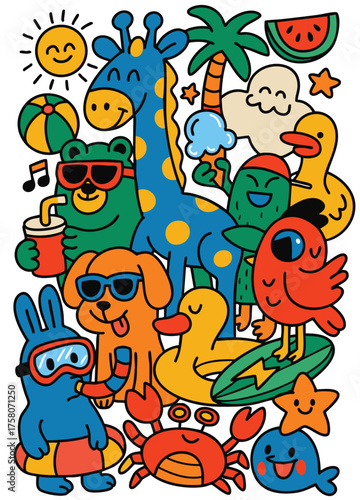 © Pakpong, Fototapeta premium Summer animal cartoon giraffe bear dog duck parrot beach happy colorful playful