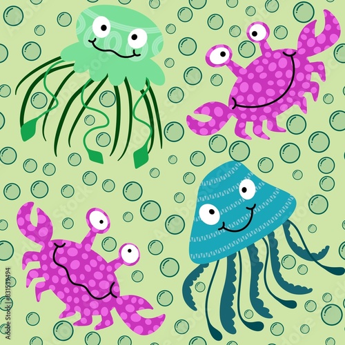 © Tetiana, Naklejka premium Summer animals print seamless cartoon crabs and jellyfish pattern for wrapping