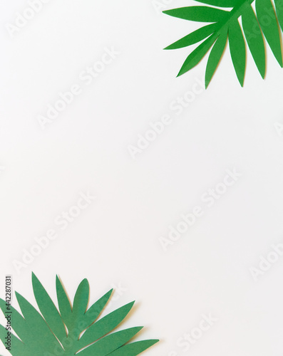 © Kulbabka, Fototapeta premium Summer background with colorful paper tropical leaves.
