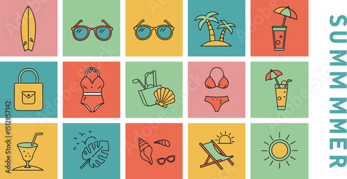 © scar, Fototapeta premium Summer backgrounds, pattern, cards, banner templates. Hand drawn modern illustrations, doodles with sea shells, surf boards, beach chair,