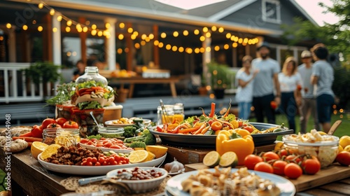 Fototapeta premium Summer Backyard Party with BBQ Food, Fresh Salads, and Families Celebrating...