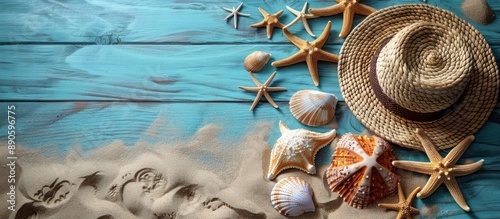 Naklejka premium Summer Beach Background with Sand, Shells, and a Straw Hat