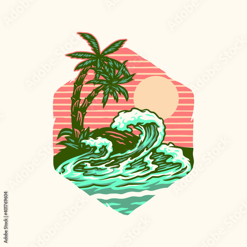Fototapeta premium Summer beach t-shirt graphic design, hand drawn line style with digital color, vector illustration