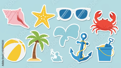 © holik, Naklejka premium Summer Beach Vacation Icons Collection with Seashell Starfish Sunglasses Crab Palm Tree.