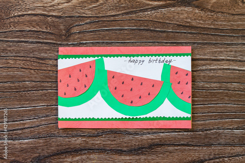 Obraz premium Summer birthday card with watermelons with birthday greetings. Handmade. Childrens creativity project, crafts for kids.