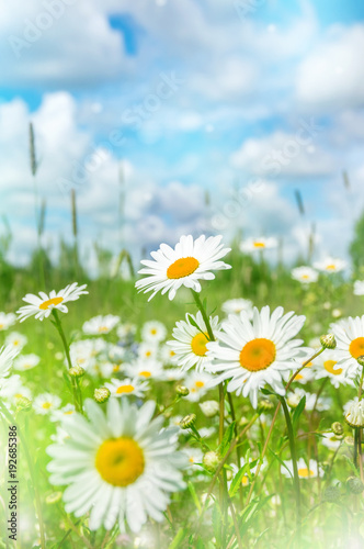 Naklejka premium Summer bright landscape with beautiful wild flowers camomiles. Daisies in the...