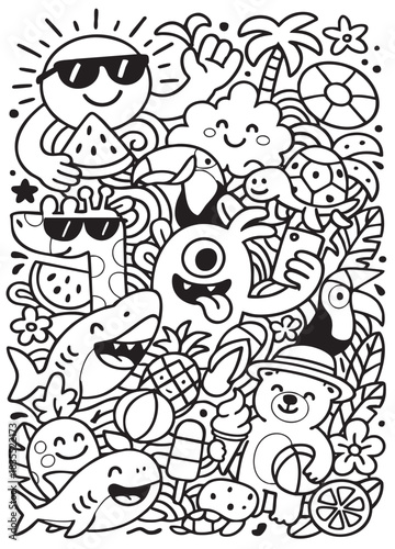 Fototapeta premium Summer cartoon black and white doodle happy beach animal fruit tropical fun...