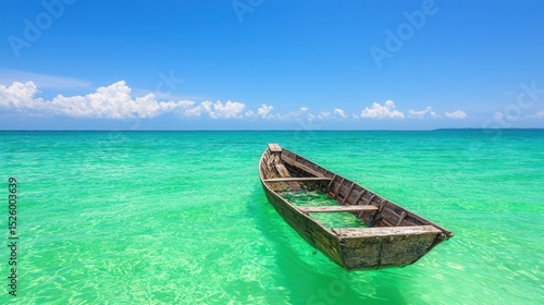© Ai7, Obraz premium summer concept. Serene boat floating in clear turquoise waters under a blue sky.