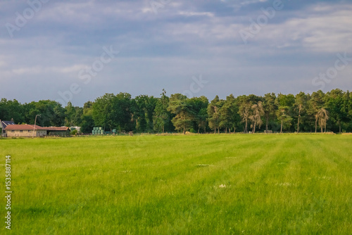 Fototapeta premium Summer countryside landscape with flat and low land under blue sky, Typical...