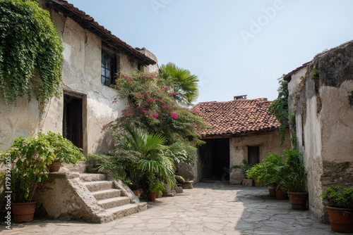 © Nino, Fototapeta premium summer courtyard with seamless ar reconstruction of house from years ago featuring lush greenery and