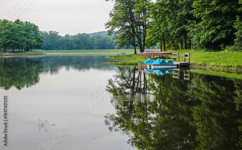 © ehrlif, Naklejka premium Summer Day At The Lake. Paddleboats and canoes line the shore of the lake at Scioto State Park in Chillicothe, Ohio