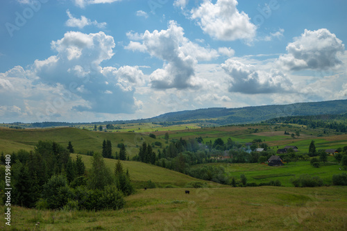 Obraz premium Summer day landscape with cloudy sky, mountains, small houses. Carpathian...